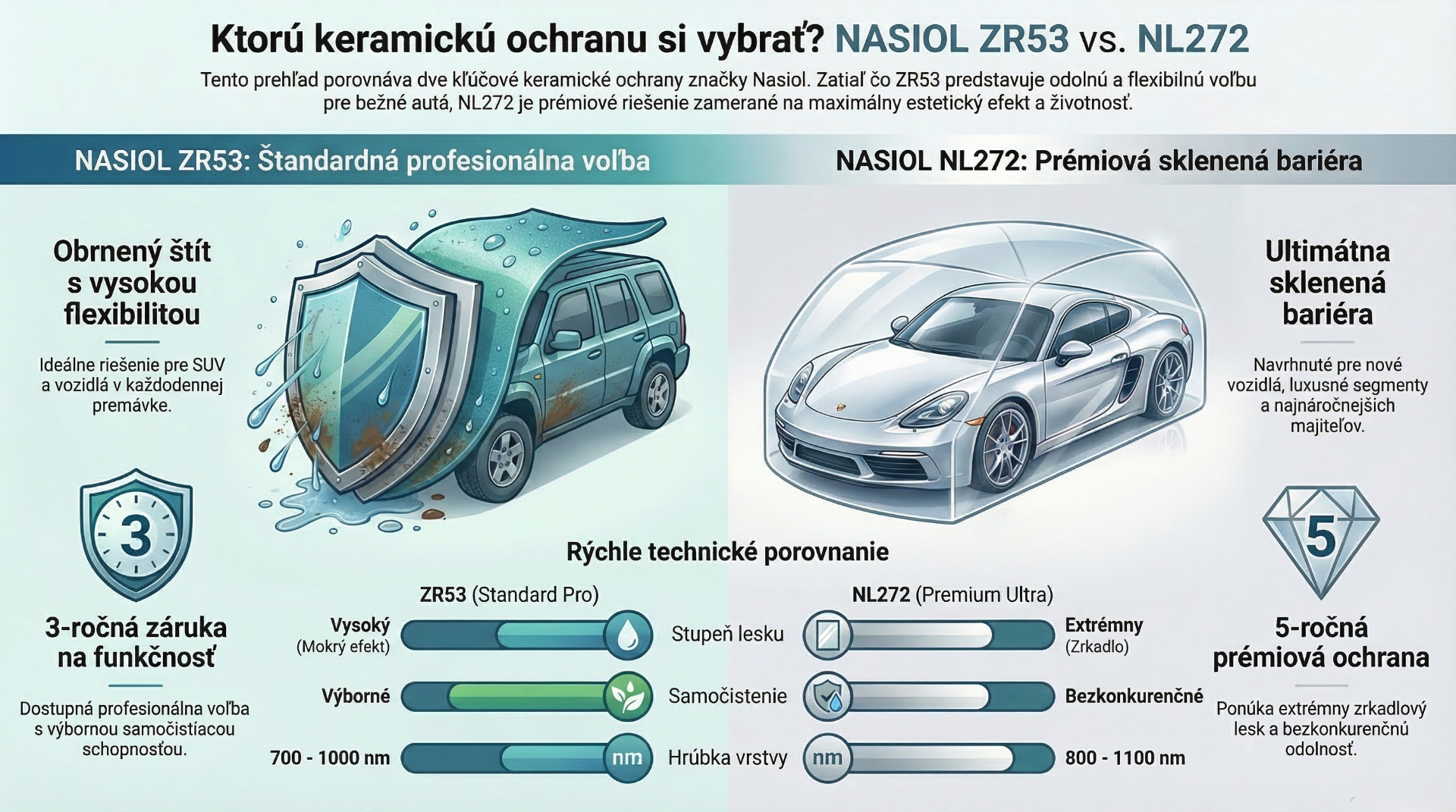 Základná trieda keramickej ochrany laku od prémiového výrobcu NASIOL. Jedná sa o profesionálny keramický povlak s tvrdosťou 9h, vysokým leskom a vynikajúcou hydrofóbnosťou ktorý má výdrž 18 mesiacov. Oživuje pôvodnú farbu auta a zabezpečí jeho atraktívny vzhľad. Jednou vrstvou vytvorí tenký a tvrdý keramický povlak na karosérii vozidla, čím poskytne ochranu pred drobnými škrabancami, UV lúčmi, chemikáliami či inými vonkajšími nečistotami ako vtáčí trus, posypová soľ či dážď.